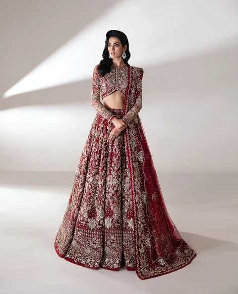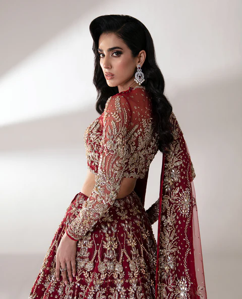 This exquisite net lehenga-choli ensemble blends traditional craftsmanship with contemporary flair. The front-open choli dazzles with hand-placed sequins, dabka, and nakshi, featuring 3D fabric leaves and delicate pearl beading. The lehenga showcases a detailed jaal border with raisham threads in silver and gold, while the organza dupatta adds elegance with a chata patti border in three colors and intricate sequin detailing. A coveted jewel in bridal couture, this ensemble epitomizes elegance and artisanship.