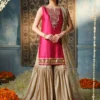 This vibrant pink short shirt is a delightful piece, adorned with delicate details of golden nakshi, shimmering golden sequins, and green and red bugle beads, complemented by golden dabka along the neckline. It pairs beautifully with an exquisitely screen-printed Korean raw silk gharara, featuring a stunning gota border at the hem. The ensemble is completed with a matching screen-printed dupatta, elegantly finished with pink and gold facing on all four sides. This outfit radiates charm and sophistication, perfect for festive occasions or celebrations!