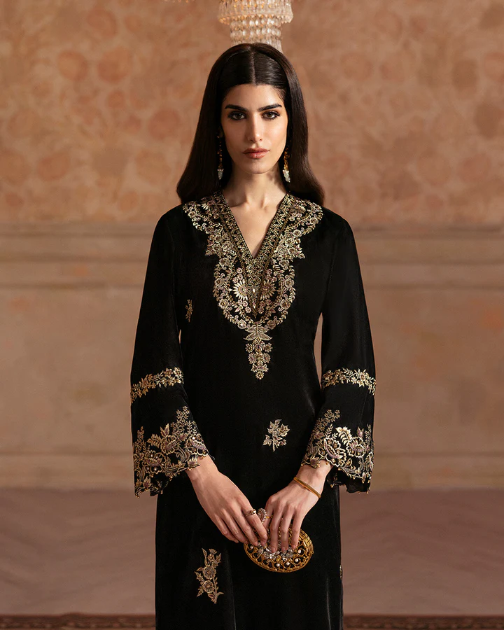 Capturing the true essence of timeless crafts, Vita showcases opulence and artistic flair. Crafted on black velvet, the shirt and trousers feature a majestic web of floral motifs wrought using tilla and resham stitches. Adding a layer of refinement and visual interest to the outfit is a dazzling spray of mirror work. This set includes a contrasting ivory embroidered shawl, making it a versatile addition to your festive wardrobe.