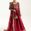 The Zarifa anghrakha from Maysa Bridal Couture’s ’24 Collection is a breathtaking blend of bridal opulence and timeless elegance. Crafted from luxurious sheer yellow organza, it exudes an ethereal glow, draping the body in a regal, flowing silhouette. The intricate zardozi embroidery, handwoven with shimmering sequins, beads, and golden threadwork, creates a stunning display of artistry, while crystal and pearl accents add a soft, luminous touch. The wrap-style front cinches at the waist, creating a flattering shape, while the asymmetrical hemline and voluminous sleeves bring a modern sophistication. Paired with a rich, embellished lehenga and a sheer organza dupatta with delicate borders and scattered embellishments, the Zarifa offers a luxurious, graceful bridal look, perfect for making an unforgettable statement of beauty and elegance on the special day.