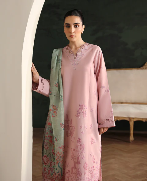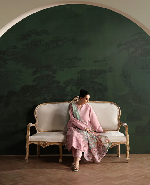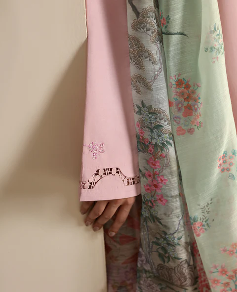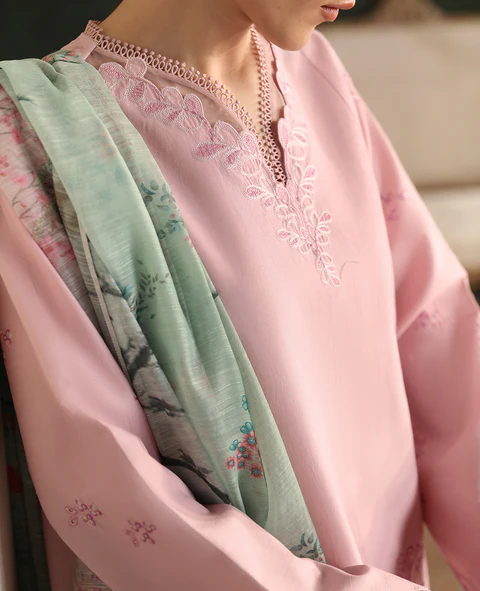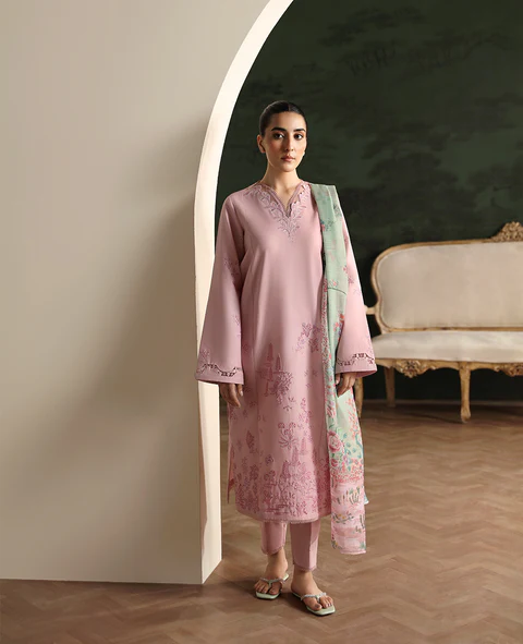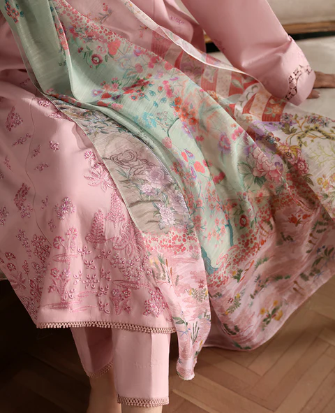 Indulge in the exquisite charm of this monochromatic ensemble, where stunning embroidery meets contemporary design. The shirt features a striking standing motif, enhanced by precise needlework and an elegant organza neckline that exudes sophistication. The sleeves are adorned with intricate stitching details, adding a refined touch to the overall look. Complementing the shirt. The trouser showcases delicate lace accents, while the printed dupatta introduces a stylish, eye-catching element that ties the entire outfit together in a harmonious blend of modern elegance and artisanal flair.
